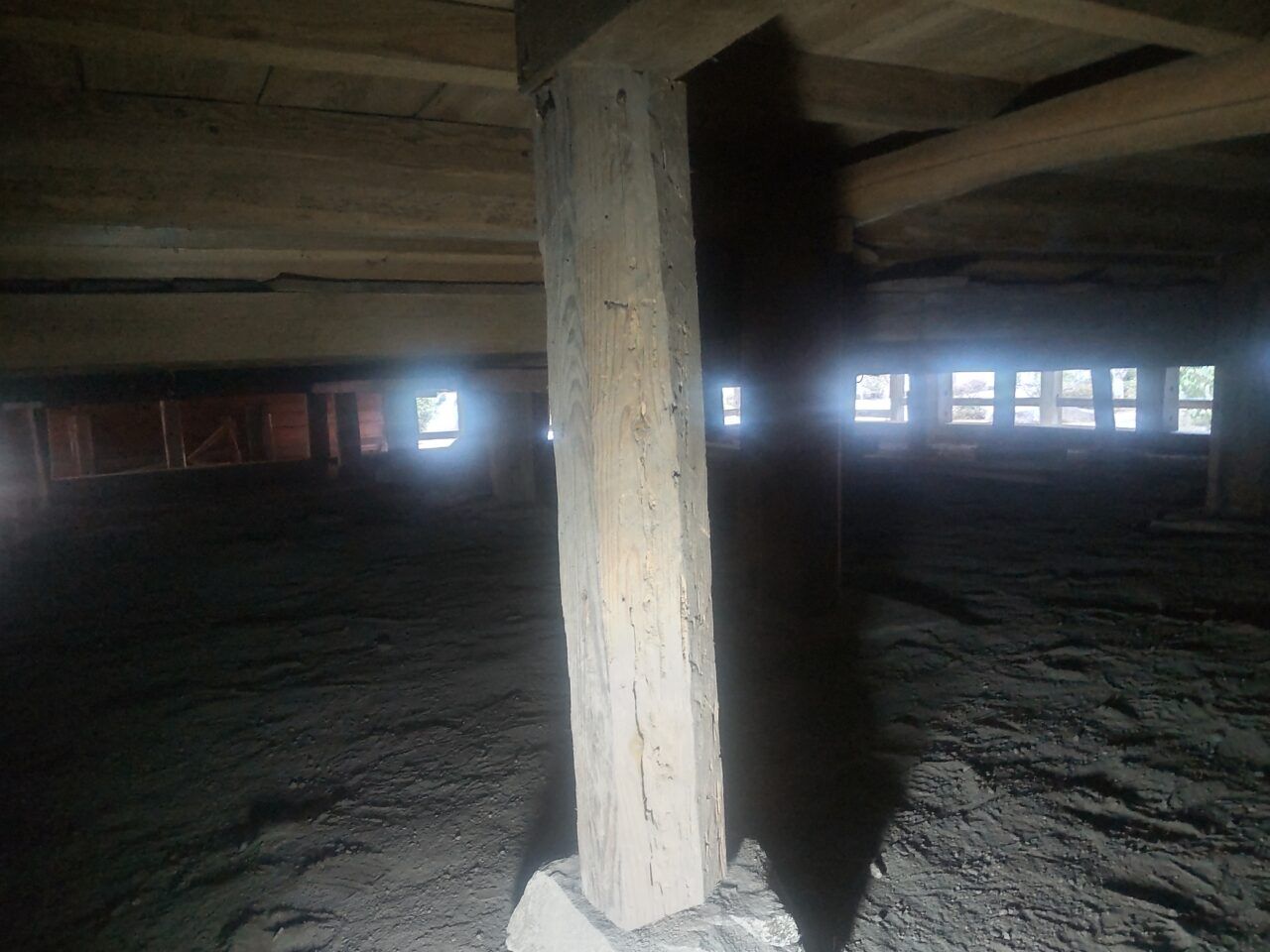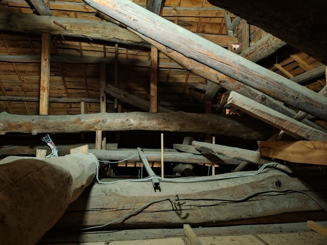 天井裏がかなり高く、大きな木材が沢山ありました。これだけ大きな建物なので、桁や梁も太いものが使ってあります。