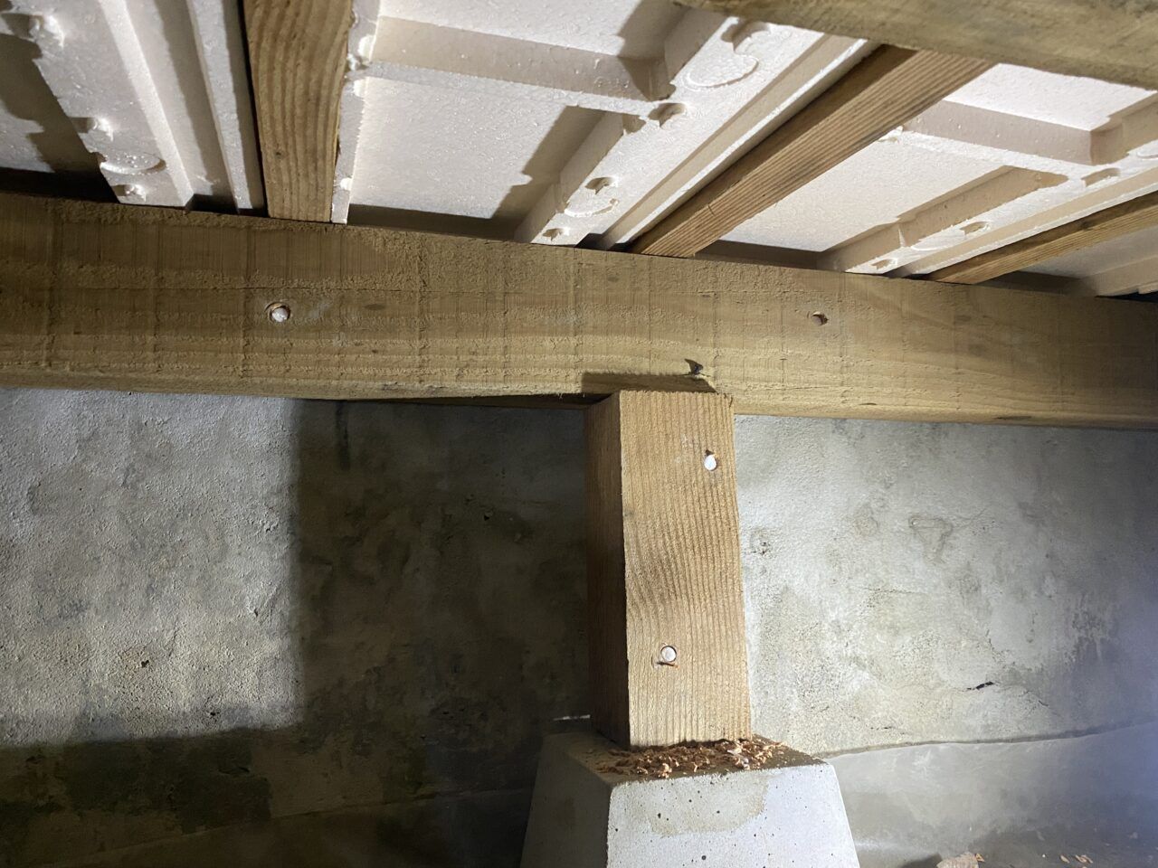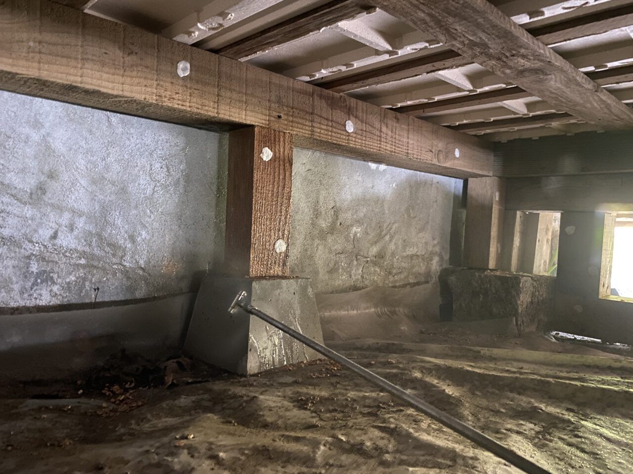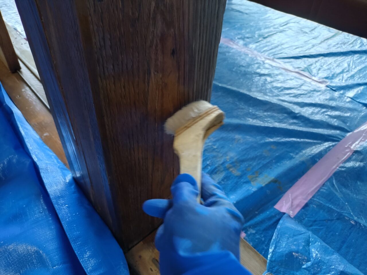 昔からある木材は石の束石にのっていましたが、補修してある木材はコンクリートの束石が設置してありました。どちらもシロアリが蟻道を作って上がって来るリスクが減るようにホウ酸水溶液を処理しました。