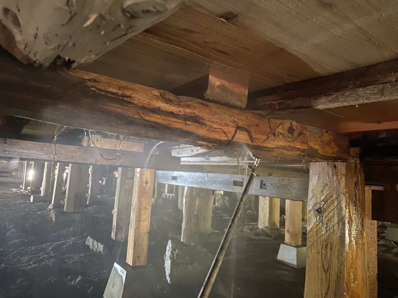 その後、床下全体にホウ酸水溶液を噴霧しました。ホウ酸には腐れの元である腐朽菌やカビを抑える効果もあります。
