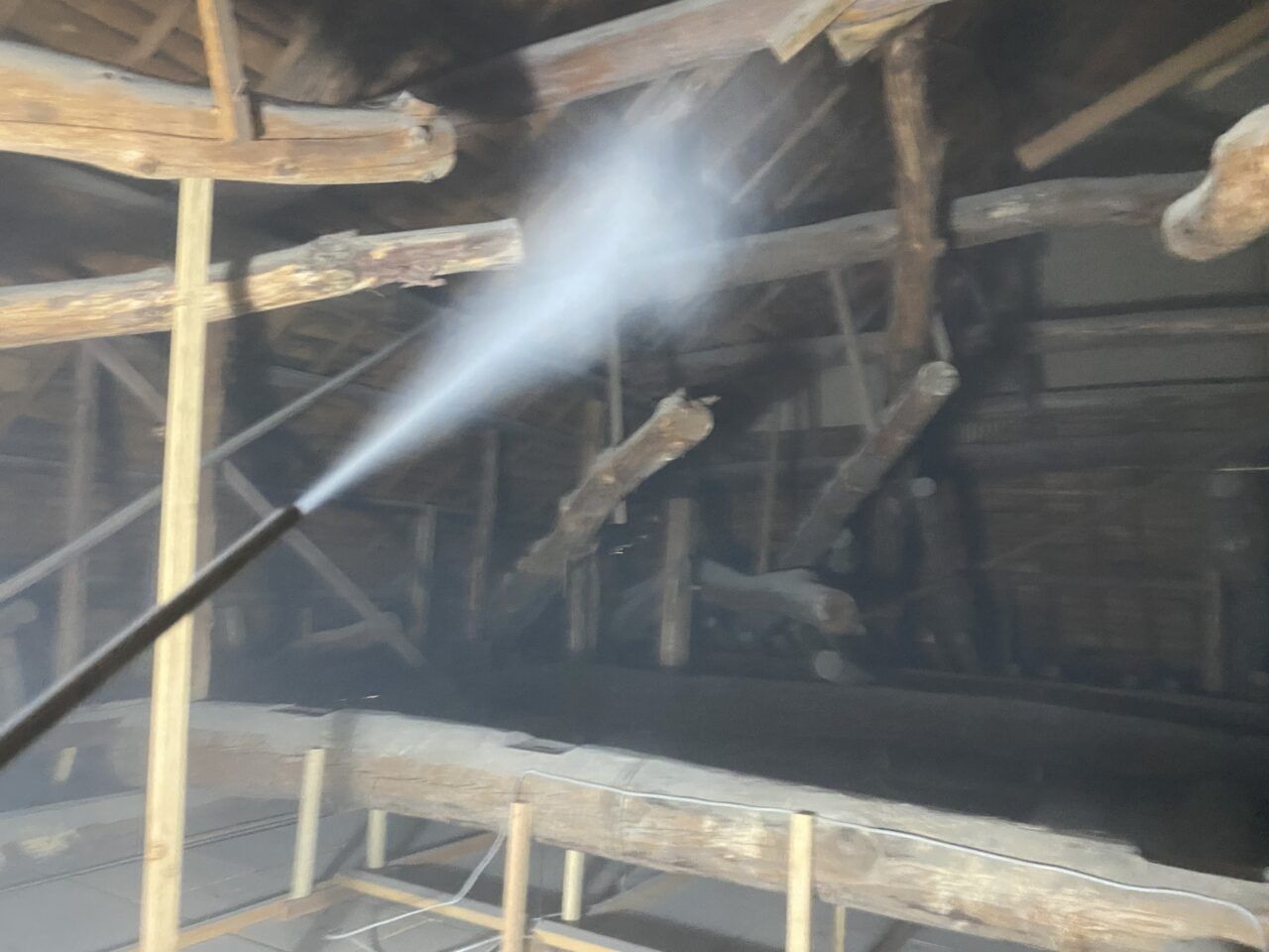 一般的なお家よりお寺など大きな建物は、小屋裏は高さ広さもかなりあるのでダスティング処理もホウ酸の粉を撒くのに時間がかかり、空間まで真っ白になります。これはシロアリだけでなく、ゴキブリやムシ対策になります。