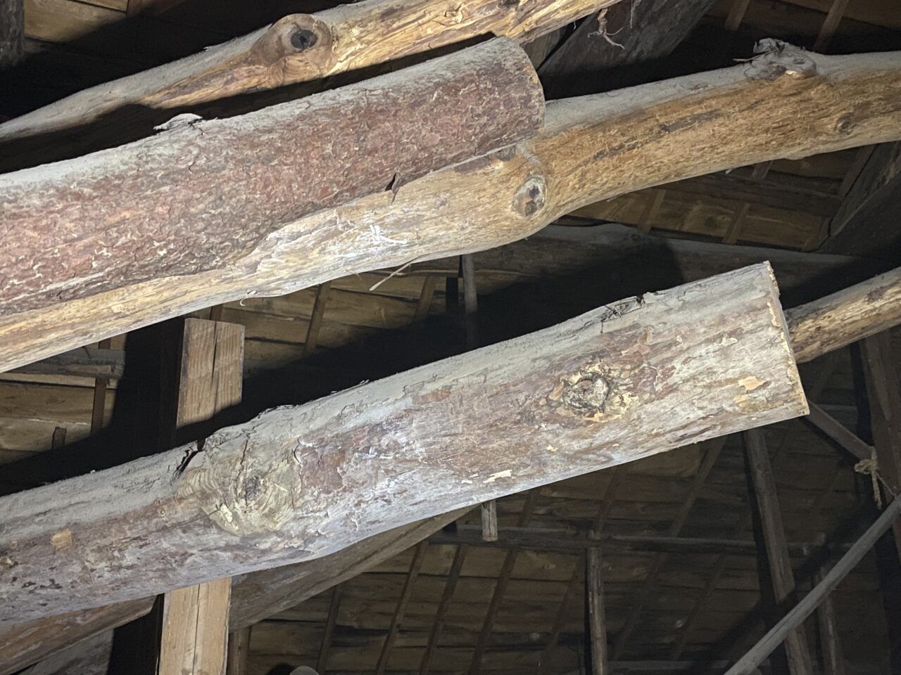 ホウ酸の粉が着いた木材です。天井の隙間からもし粉が落ちてきて、仏具にかかったらいけないので養生も丁寧に行いました。結構大変な作業でした。