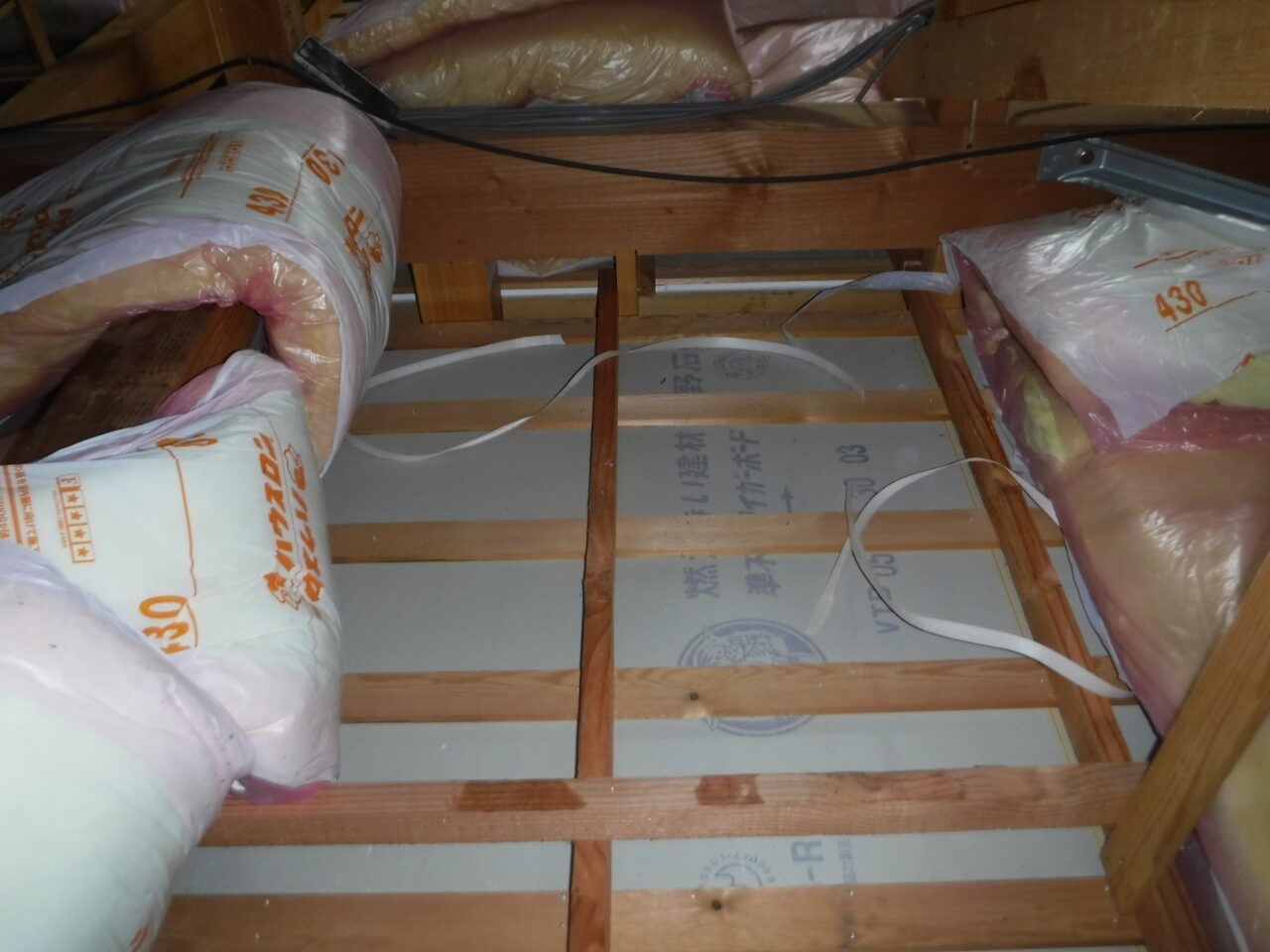 小屋裏の調査では、断熱材をめくりながら、アメリカカンザイシロアリの特徴であるフン粒やシロアリ本体がいないかをじっくり、しっかり観察しました。幸いにも小屋裏には被害がありませんでした。